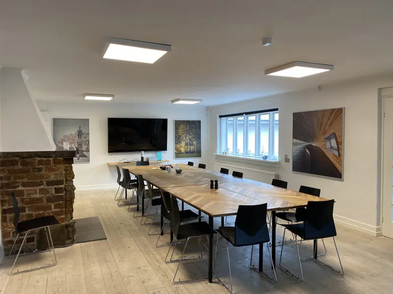 Der er mulighed for at benytte storskærm hvis I har brug for det, og der er webcam til onlinemøder hvis dette er relevant. Husk i så fald at medbringe en computer med HDMI- eller USB-C-indgang. Læs mere nedenfor under Teknisk udstyr.