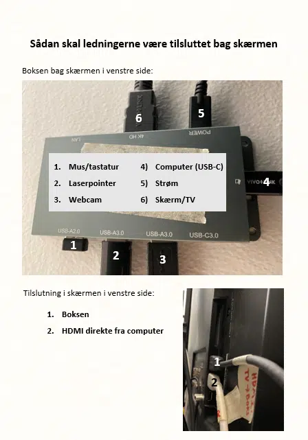 Det kræver at din computer har en USB-C-indgang. Kablet gør at din computer både bliver tilsluttet storskærm, strøm og webcamera. - Det lange hvide kabel med labelnavn "HDMI" (skærm)".
